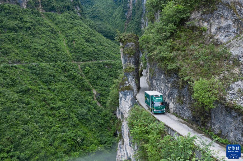 郵車(chē)行進(jìn)在通往四川省漢源縣永利鄉古路村的山路上(6月23日攝,無(wú)人機照片)。新華社記者 江宏景 攝