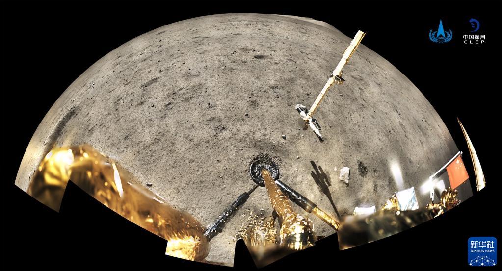 2020年12月4日,國家航天局公布了探月工程嫦娥五號探測器在月球表面國旗展示的照片。嫦娥五號著(zhù)陸器和上升器組合體全景相機環(huán)拍成像,五星紅旗在月面成功展開(kāi),此外圖像上方可見(jiàn)已完成表取采樣的機械臂及采樣器。新華社發(fā)(國家航天局供圖)