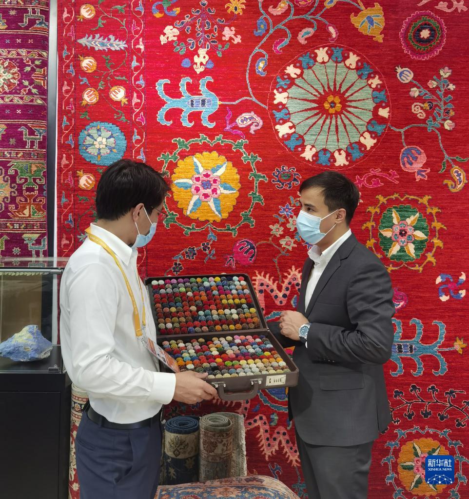 11月5日,阿富汗參展商阿里·法伊茲(右)在第四屆進(jìn)博會(huì )阿富汗手工羊毛地毯展臺忙碌。新華社記者 吳宇 攝