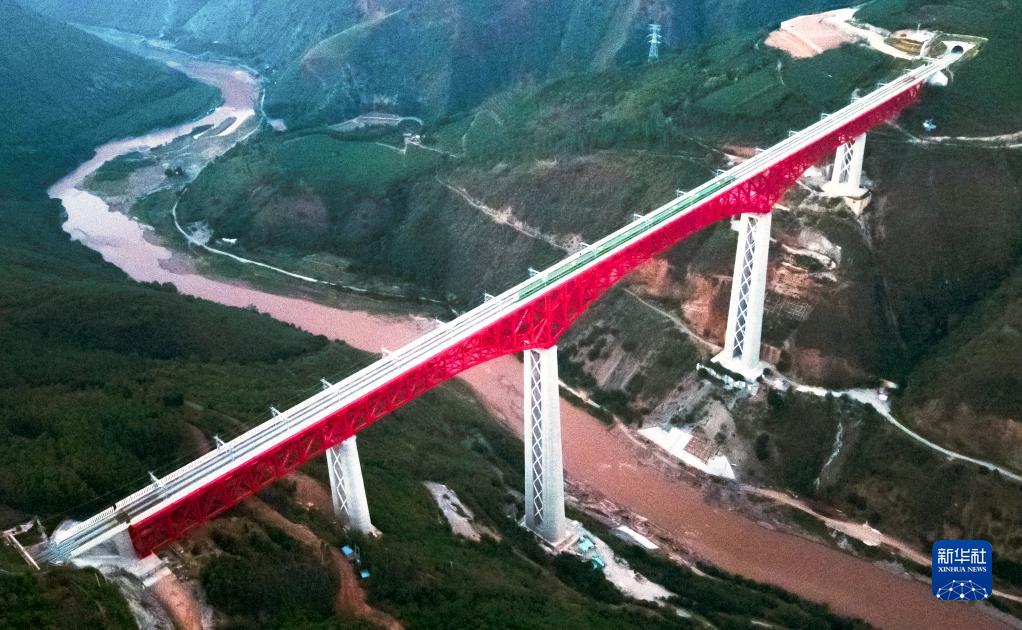 中老鐵路首發(fā)列車(chē)駛過(guò)中國云南省元江哈尼族彝族傣族自治縣境內的元江雙線(xiàn)特大橋(12月3日攝,無(wú)人機照片)。新華社記者 王冠森 攝