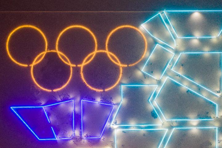 一個(gè)巨型冰五環(huán)在封凍的松花江上亮相