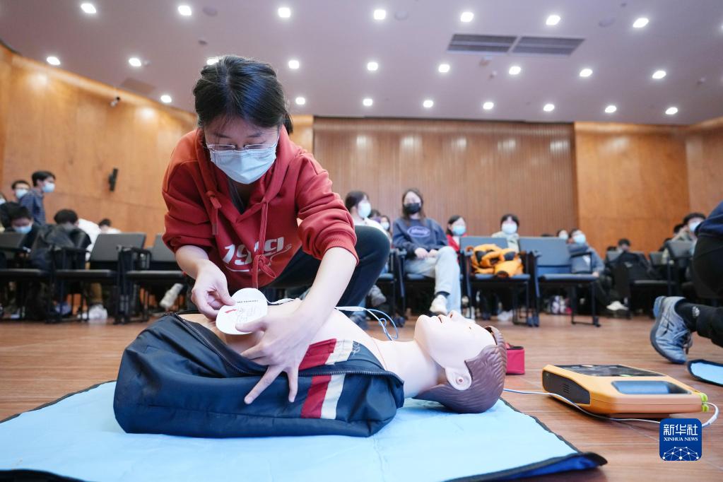 2021年11月28日,清華大學(xué)舉辦面向冬奧學(xué)生志愿者的“心肺復蘇及AED使用急救技能”工作坊,這是冬奧學(xué)生志愿者在急救技能培訓上學(xué)習使用自動(dòng)除顫器。新華社記者 鞠煥宗 攝