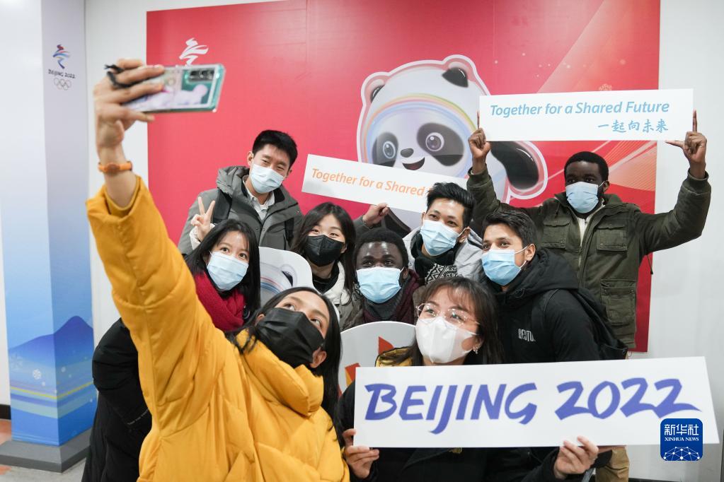 2021年12月30日,參加場(chǎng)館培訓的外籍志愿者在北京五棵松體育中心合影。新華社記者 鞠煥宗 攝