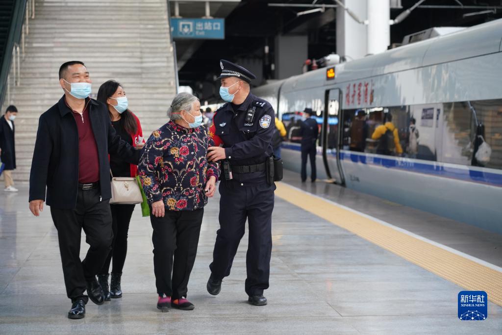 民警楊仁德在福州車(chē)站協(xié)助旅客出行(1月8日攝)。新華社發(fā)
