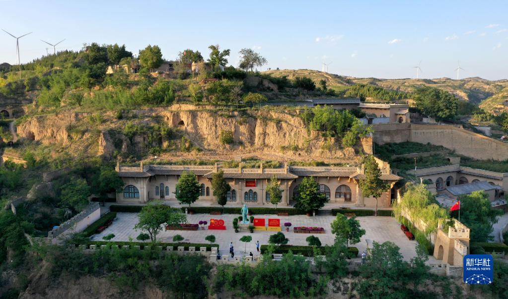 游人在陜西省榆林市米脂縣楊家溝革命舊址參觀(guān)(2021年9月10日攝,無(wú)人機照片)。新華社記者 陶明 攝