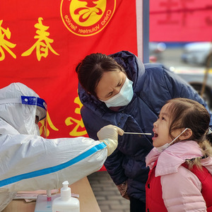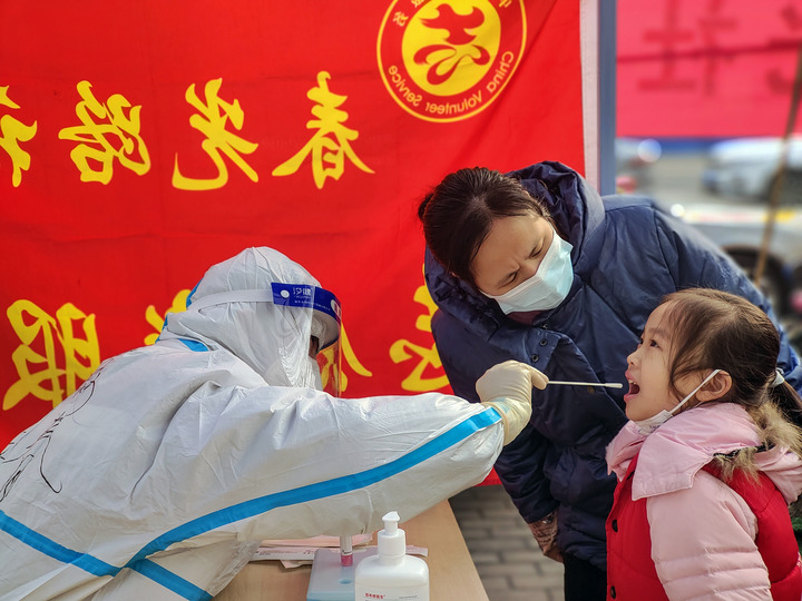 在安陽(yáng)市文峰區紫薇大道街道春光路社區,醫護人員為一名小朋友進(jìn)行核酸檢測取樣(1月11日 麻翛然攝)