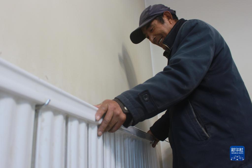 2020年12月1日,青海省西寧市湟源縣申中鄉前溝村村民王錄在感受新裝暖氣片的溫度。新華社記者 解統強 攝