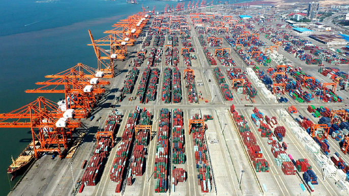 1月19日拍攝的欽州港碼頭的集裝箱儲放地(無(wú)人機照片)。新年伊始,廣西欽州港生產(chǎn)工作緊張有序進(jìn)行,一派繁忙景象。新華社記者 張愛(ài)林 攝