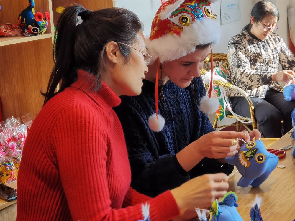李小梅(左一)在教前來(lái)參觀(guān)的當地外教制作黎侯虎。新華社記者王學(xué)濤攝