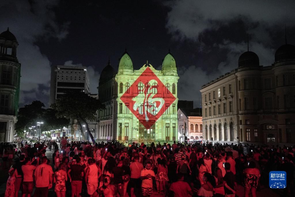 1月30日,人們在巴西累西腓觀(guān)看“慶新春、迎冬奧”燈光秀。新華社記者 王天聰 攝