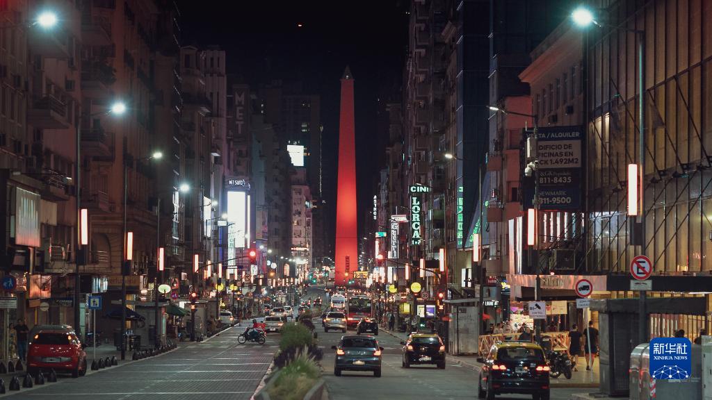 這是1月31日在阿根廷首都布宜諾斯艾利斯拍攝的亮起“中國紅”的方尖碑。新華社發(fā)(第四屆“中國春節文化之旅”主辦方供圖)