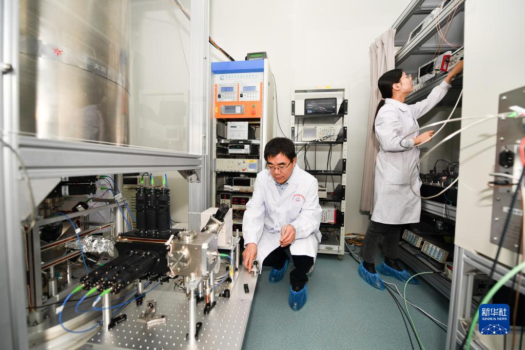 2月8日,中國科學(xué)院國家授時(shí)中心首席科學(xué)家張首剛(左)在銫原子噴泉鐘實(shí)驗室工作。新華社記者 張博文 攝