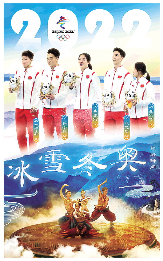 當團隊把目光放深遠,東西方文化的傳播和碰撞,電光火石般地激發(fā)出團隊無(wú)限的創(chuàng )意火花——團隊找到了能同時(shí)承載千年來(lái)東西方文化傳播、碰撞,又在視覺(jué)表達上與冰雪運動(dòng)相融的敦煌舞。一方面,敦煌文化和奧林匹克運動(dòng)都能展現世界文化精粹的融合之美;另一方面,飛天與冰雪運動(dòng)展現空中技巧時(shí)有異曲同工之妙。于是,“共舞”“融合”“傳承”被確定為創(chuàng )意關(guān)鍵詞。
