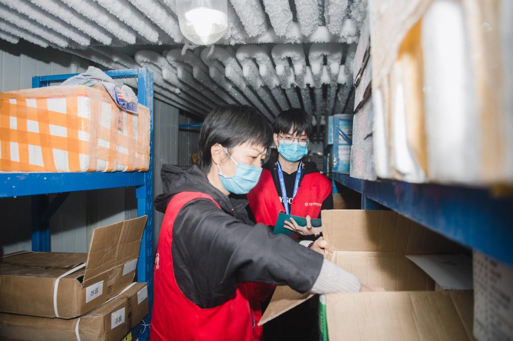 2021年11月10日,寧波水產(chǎn)品批發(fā)市場(chǎng)的工作人員在查看一家商戶(hù)銷(xiāo)售的進(jìn)口冷凍水產(chǎn)的“三證一碼”。新華社記者江漢 攝