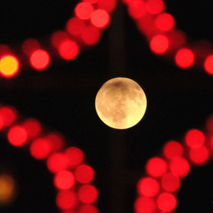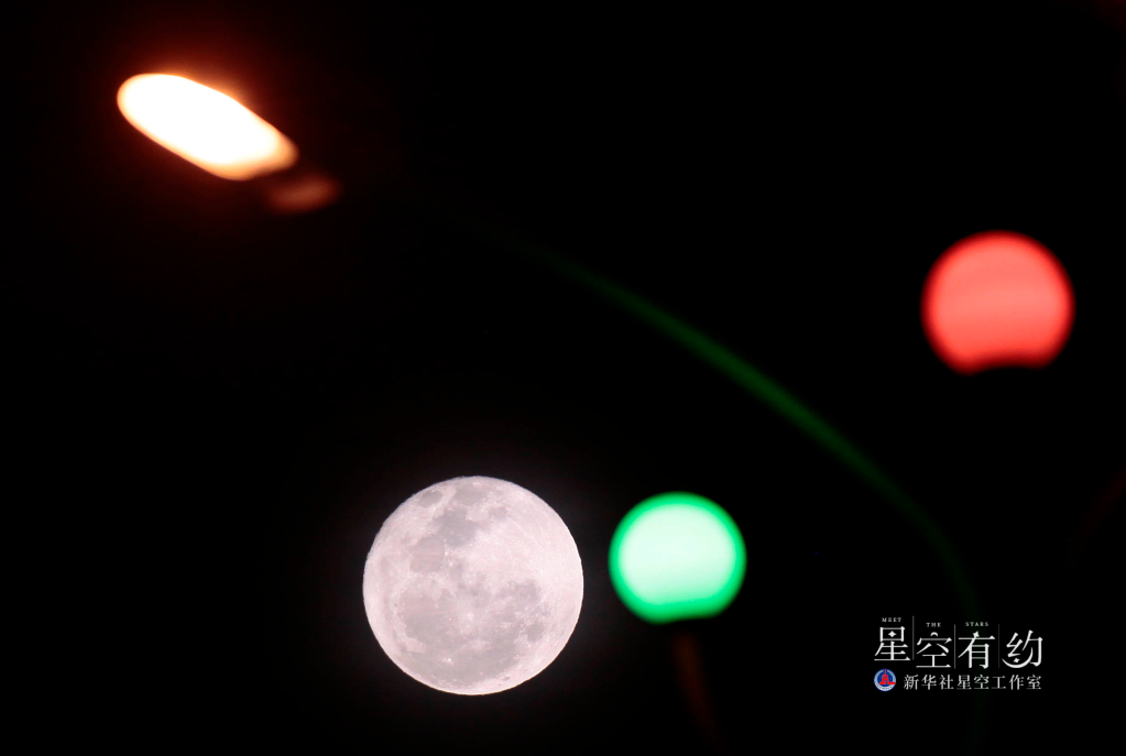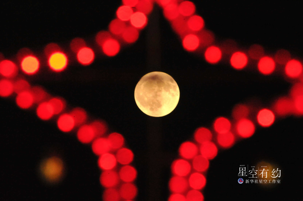 這是2013年2月26日凌晨在山西省運城市新絳縣拍攝的圓月和彩燈。(新華社發(fā))