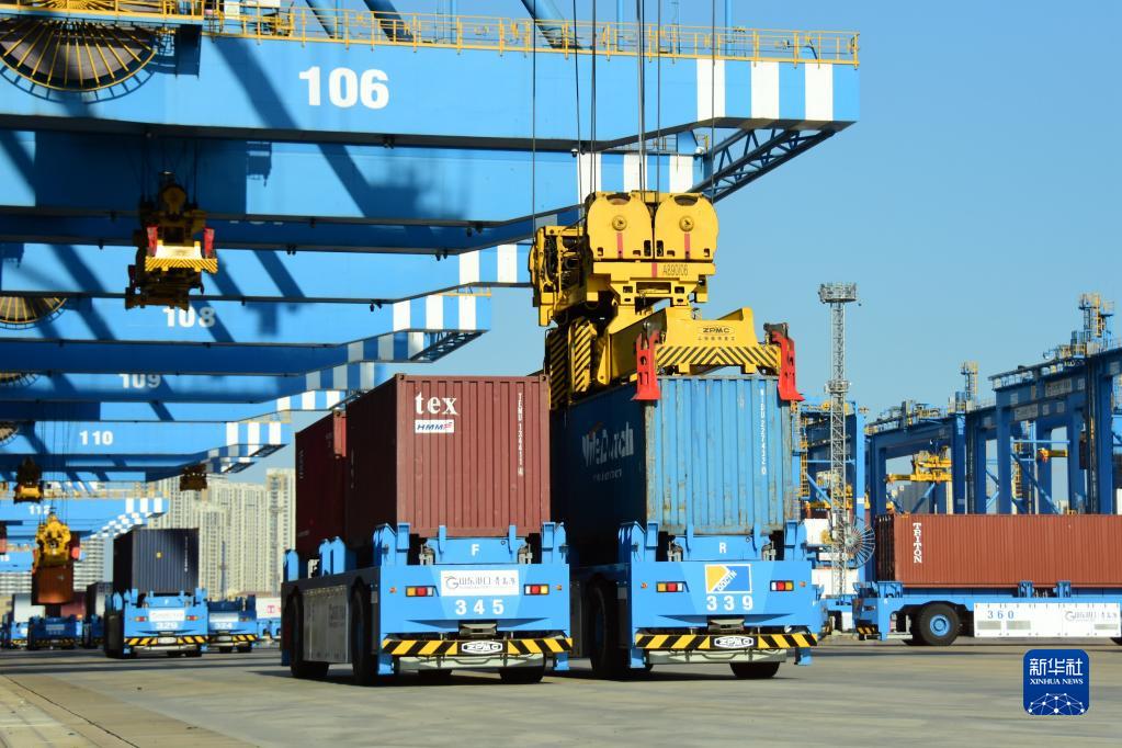2月20日,在山東港口青島港全自動(dòng)化碼頭,AGV來(lái)回穿梭。新華社記者 陳灝 攝