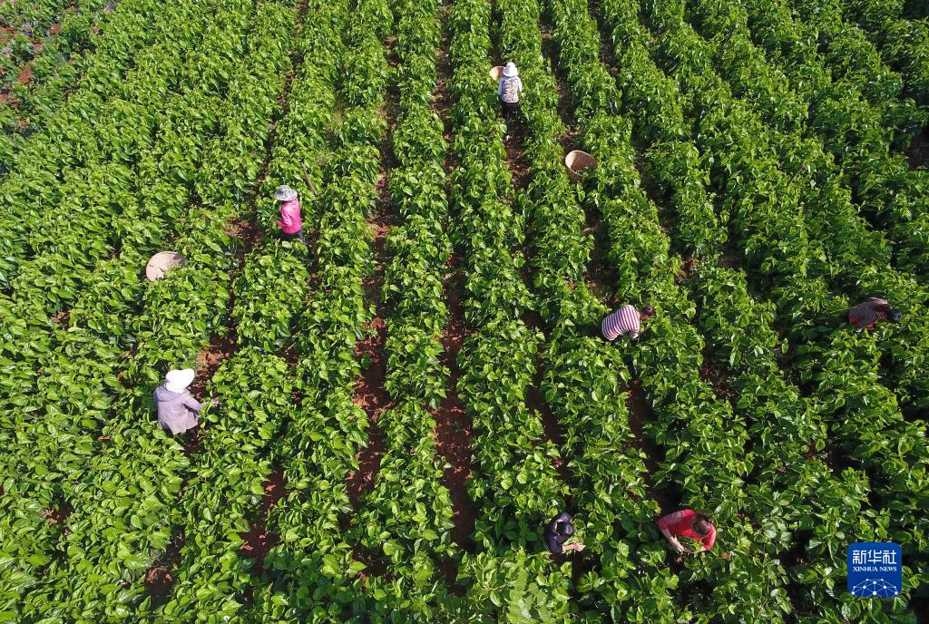 云南尋甸縣金所街道草海子村的農婦在采摘蠶桑葉(2020年5月16日攝,無(wú)人機照片)。當地大力發(fā)展蠶桑等特色種養殖和加工產(chǎn)業(yè),帶動(dòng)農民脫貧增收致富。新華社記者 楊宗友 攝