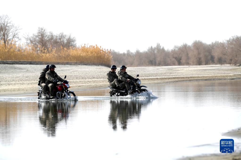 在國家級公益林尉犁縣羅湖羅克管護站,護林員騎著(zhù)摩托車(chē)蹚過(guò)塔里木河去查看胡楊長(cháng)勢情況(2月22日攝)。新華社記者 趙戈 攝