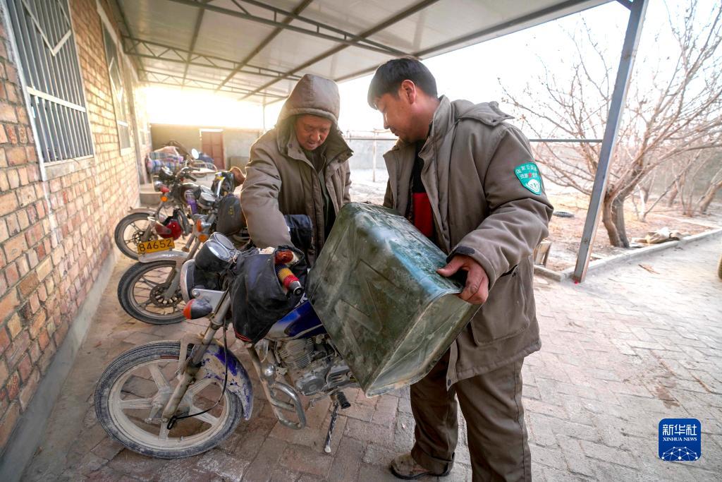 在國家級公益林尉犁縣營(yíng)盤(pán)管護站,巡護前,站長(cháng)外力·吾斯曼(左)和同事在往摩托車(chē)里倒入燃料(2月21日攝)。新華社記者 趙戈 攝
