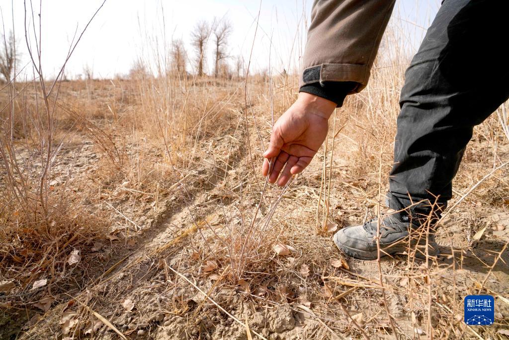 在國家級公益林尉犁縣營(yíng)盤(pán)管護站,站長(cháng)外力·吾斯曼俯身指著(zhù)地上一叢叢像紅柳枝條的小苗介紹說(shuō),之前渴死的老胡楊,只要有水,就會(huì )從根上長(cháng)出幼苗(2月21日攝)。新華社記者 趙戈 攝