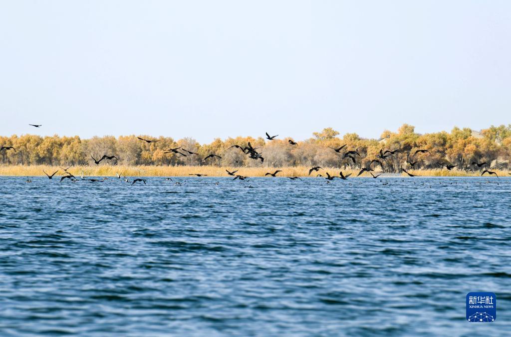在國家級公益林尉犁縣羅湖羅克管護站,鳥(niǎo)兒在一處海子上空飛翔(2021年10月27日攝)。新華社記者 趙戈 攝