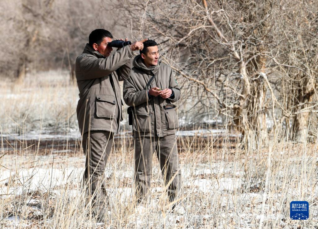 在國家級公益林尉犁縣羅湖羅克管護站,從新疆農業(yè)大學(xué)畢業(yè)的吾買(mǎi)爾·熱合曼(右)和同事在巡護胡楊(2月22日攝)。新華社記者 趙戈 攝