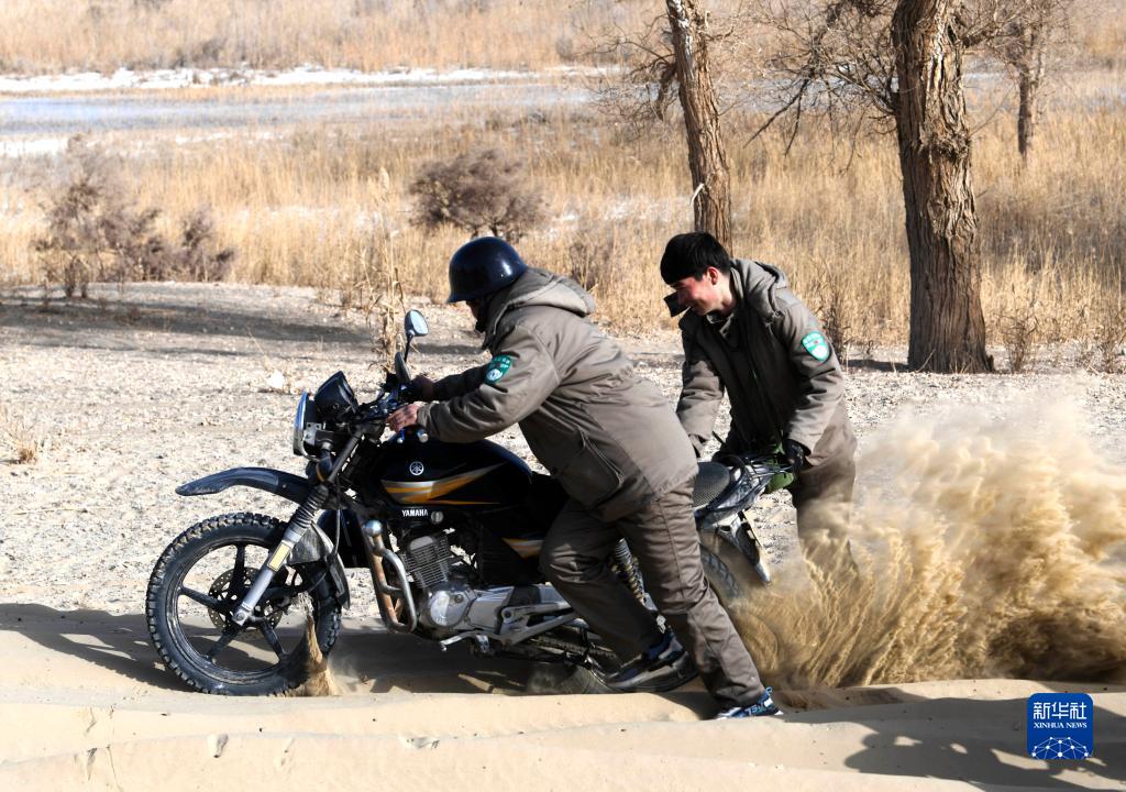 在國家級公益林尉犁縣羅湖羅克管護站,“00”后護林員米爾扎提·艾尼瓦爾(右)和同事用力推著(zhù)摩托車(chē)越過(guò)沙丘(2月22日攝)。新華社記者 趙戈 攝