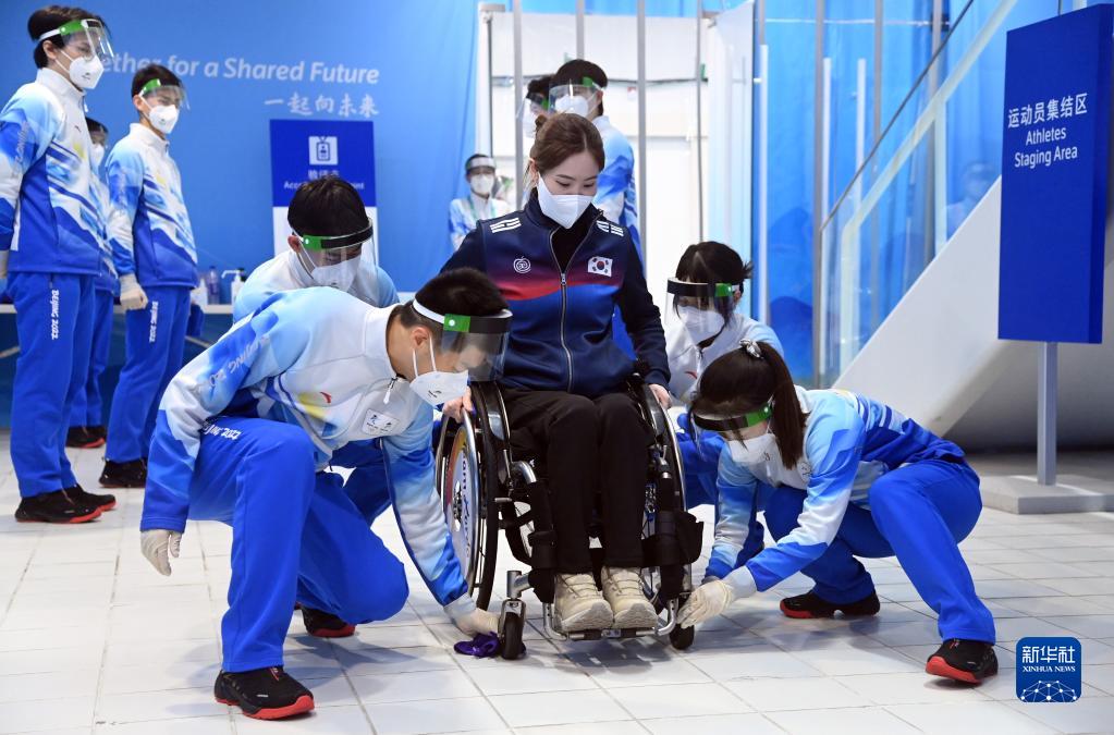 在國家游泳中心“冰立方”舉行的北京2022年冬殘奧會(huì )輪椅冰壺比賽前,志愿者們?yōu)轫n國選手白慧珍清潔輪椅(2022年3月6日攝)。新華社記者 任超 攝