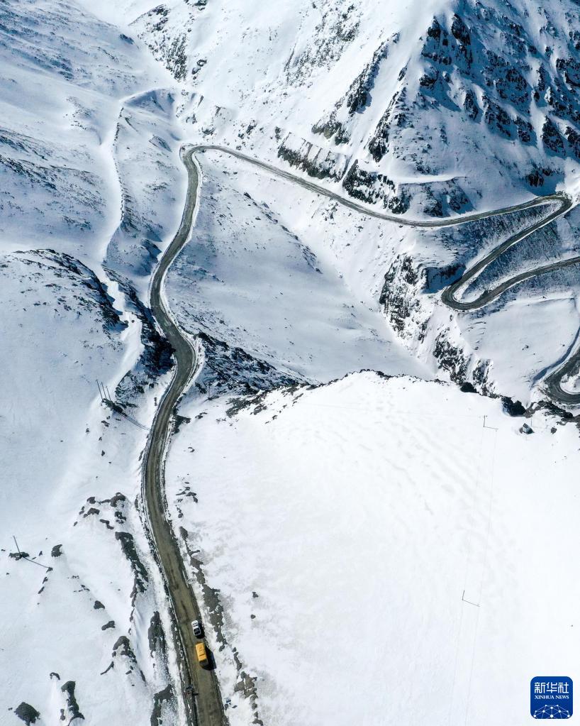 返校學(xué)生乘坐的校車(chē)翻越蓋家克達坂(2月25日攝,無(wú)人機照片)。新華社記者 丁磊 攝