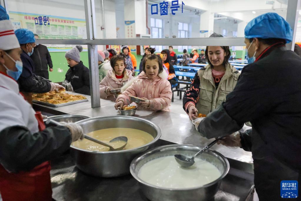 在新疆塔什庫爾干塔吉克自治縣城鄉寄宿制小學(xué),學(xué)生在食堂領(lǐng)取免費早餐(2月26日攝)。新華社記者 丁磊 攝