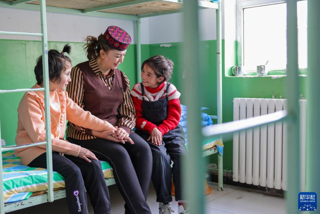 在新疆塔什庫爾干塔吉克自治縣城鄉寄宿制小學(xué),返校的學(xué)生在宿舍和生活老師聊天(2月25日攝)。新華社記者 丁磊 攝