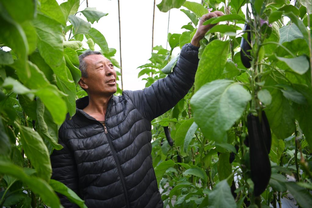 春耕時(shí)節,延安市安塞區化子坪鎮張岔村村民王慶平在大棚內給茄子掐尖。新華社記者邵瑞 攝