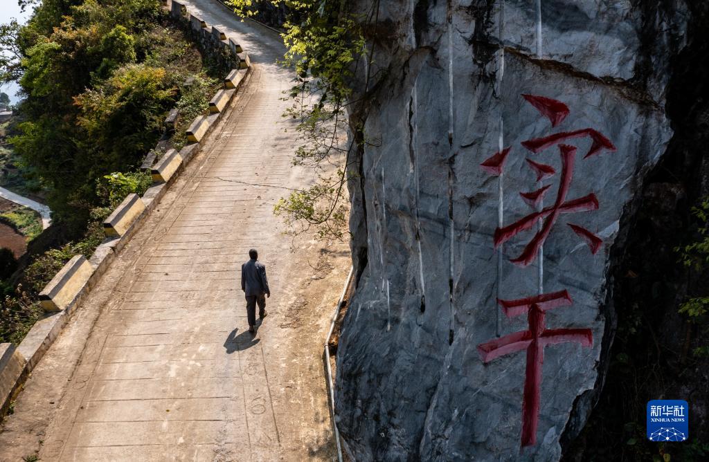 一條蜿蜒曲折的水泥路掛在山崖間、沖出亂石堆,還劈開(kāi)一塊十幾米高的巨石,在巖壁上留下刷著(zhù)紅漆的兩個(gè)大字——“實(shí)干”。