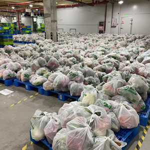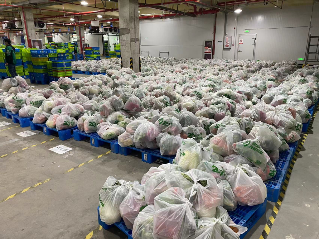 叮咚買(mǎi)菜杭州余杭城市分選中心內,一批批蔬果等物資正等著(zhù)運往上海。受訪(fǎng)對象供圖