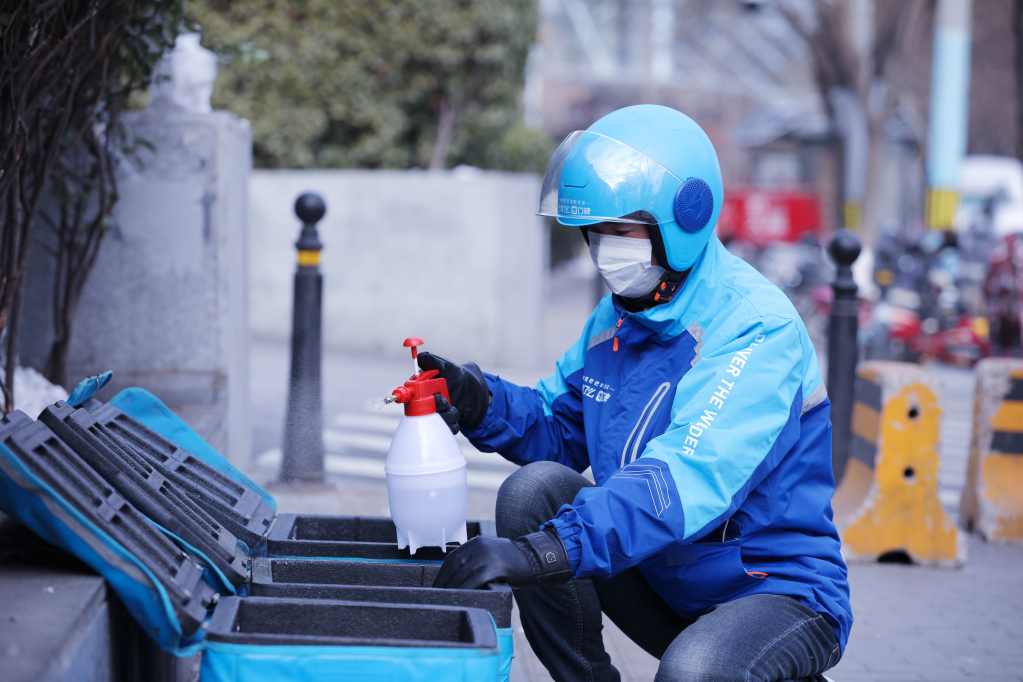 一名餓了么騎手正在為外賣(mài)箱消毒。受訪(fǎng)對象供圖