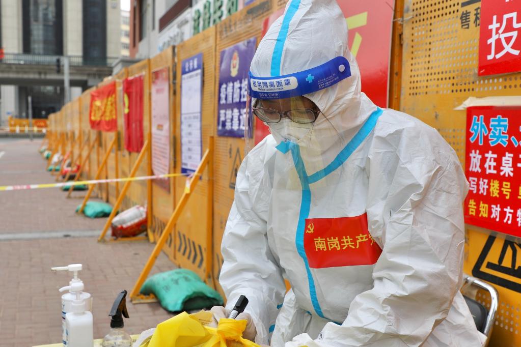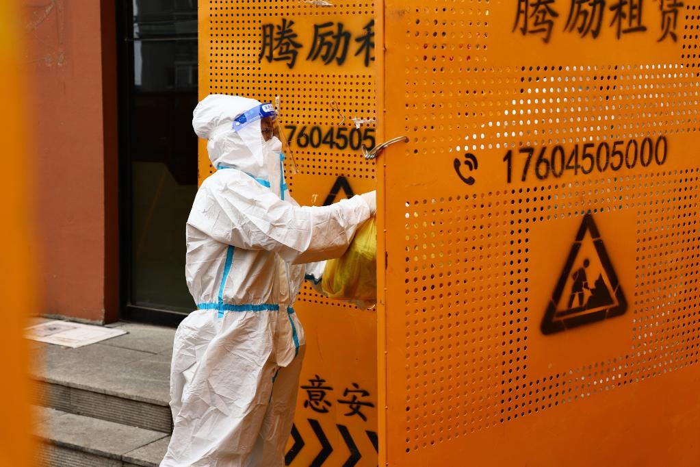 何文娟為隔離管控中的居民配送物資。新華社記者 徐凱鑫 攝