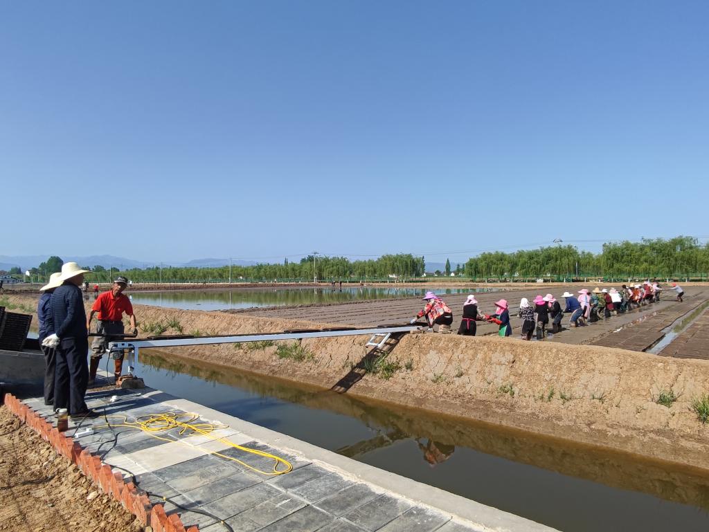 工人們在稻蝦(小龍蝦)綜合種養基地內進(jìn)行傳統育秧。(城固縣委宣傳部供圖)