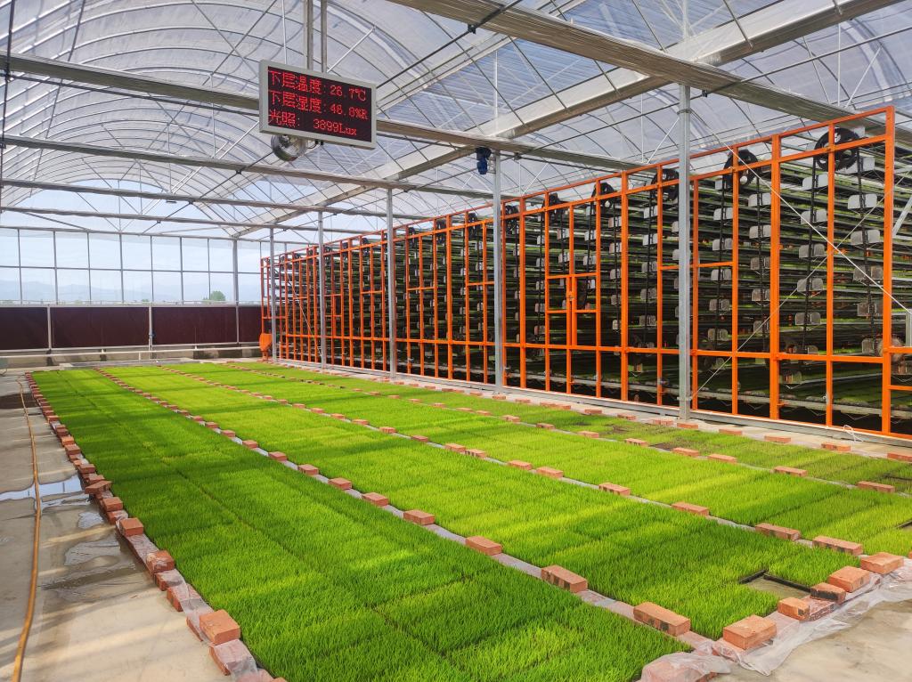育秧中心中間的電子屏會(huì )實(shí)時(shí)顯示大棚里濕度、溫度、光照和二氧化碳指數。地上為傳統育秧方式,育秧架為現代育秧方式。 (城固縣委宣傳部供圖)