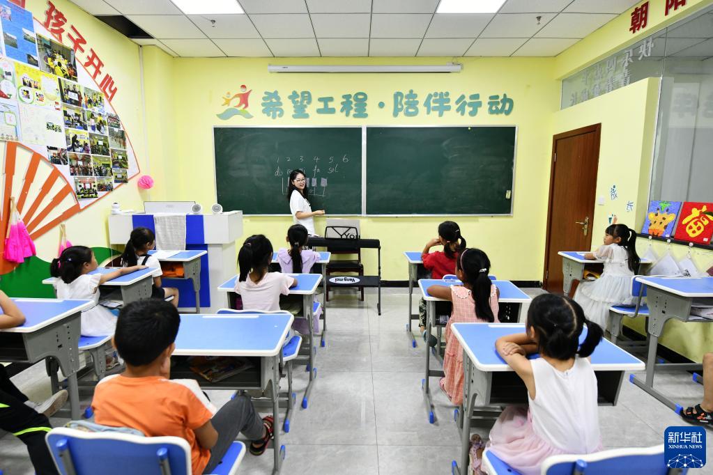 在貴州省思南縣雙塘街道麗景社區易地扶貧搬遷安置點(diǎn),大學(xué)生志愿者給孩子們上音樂(lè )課(2020年8月13日攝)。新華社記者 楊文斌 攝
