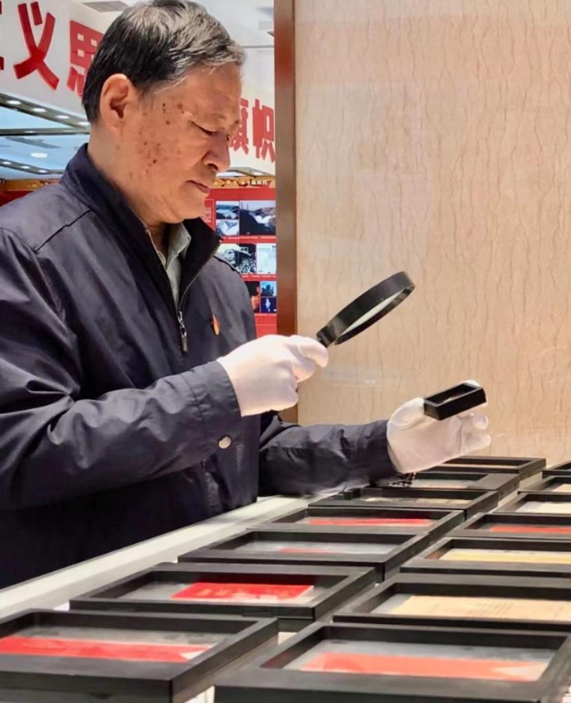 在共青團博物館,陸君祥正在整理他的藏品。(新華社記者 高銘攝)