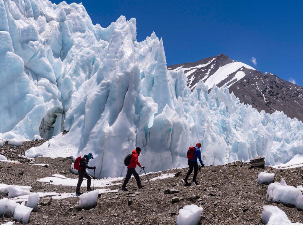 2019年5月21日,德慶歐珠(右一)在珠峰海拔6000米左右的絨布冰川冰塔林間徒步。