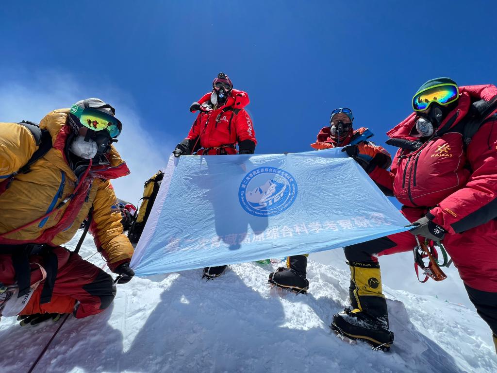 在珠穆朗瑪峰峰頂,科考隊員展示第二次青藏高原綜合科學(xué)考察研究旗幟。