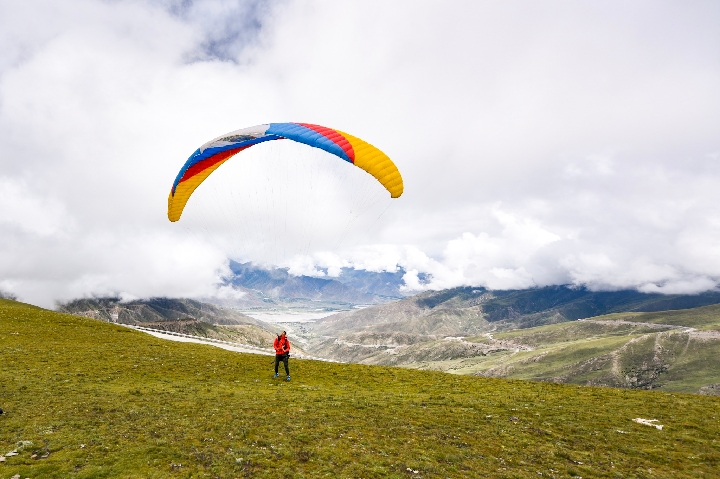 德慶歐珠在西藏練習滑翔傘運動(dòng)。