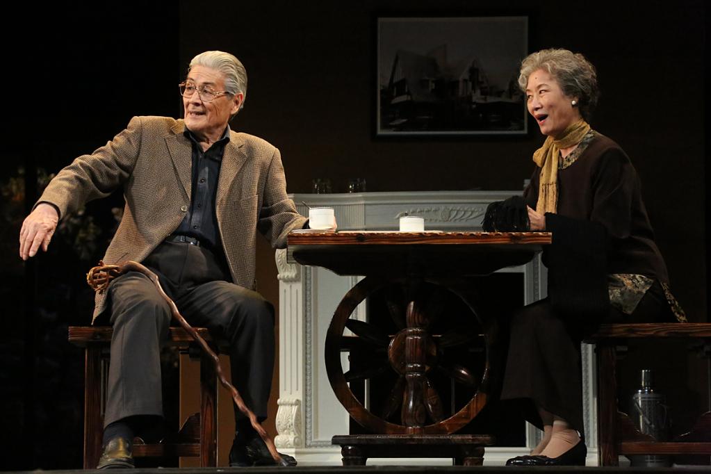 2012年9月14日,老藝術(shù)家藍天野(左)和呂中(右)在《甲子園》的演出中。當日,北京人藝年度原創(chuàng )大戲《甲子園》在北京首都劇場(chǎng)首演。新華社記者唐師曾 攝