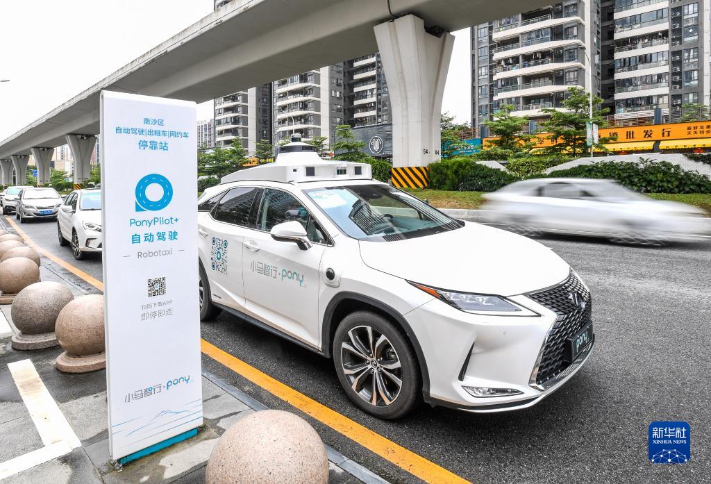 一輛由小馬智行運營(yíng)的自動(dòng)駕駛出租車(chē),在廣州南沙一個(gè)自動(dòng)駕駛??空镜却丝停?月15日攝)。新華社記者劉大偉攝