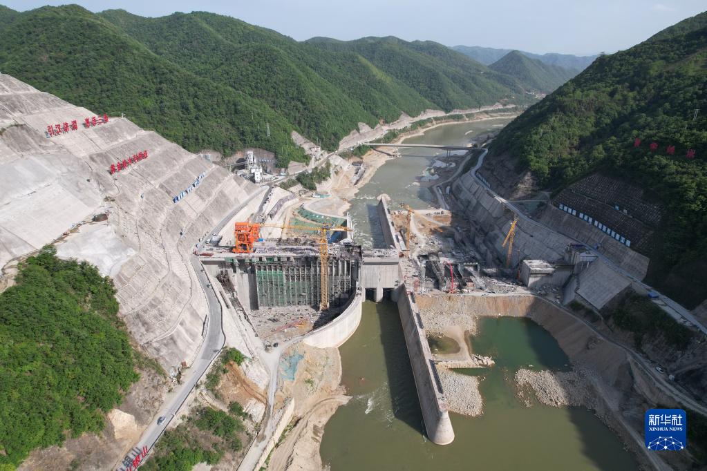 建設中的引漢濟渭工程黃金峽水利樞紐(2022年4月19日攝,無(wú)人機照片)。新華社記者 邵瑞 攝