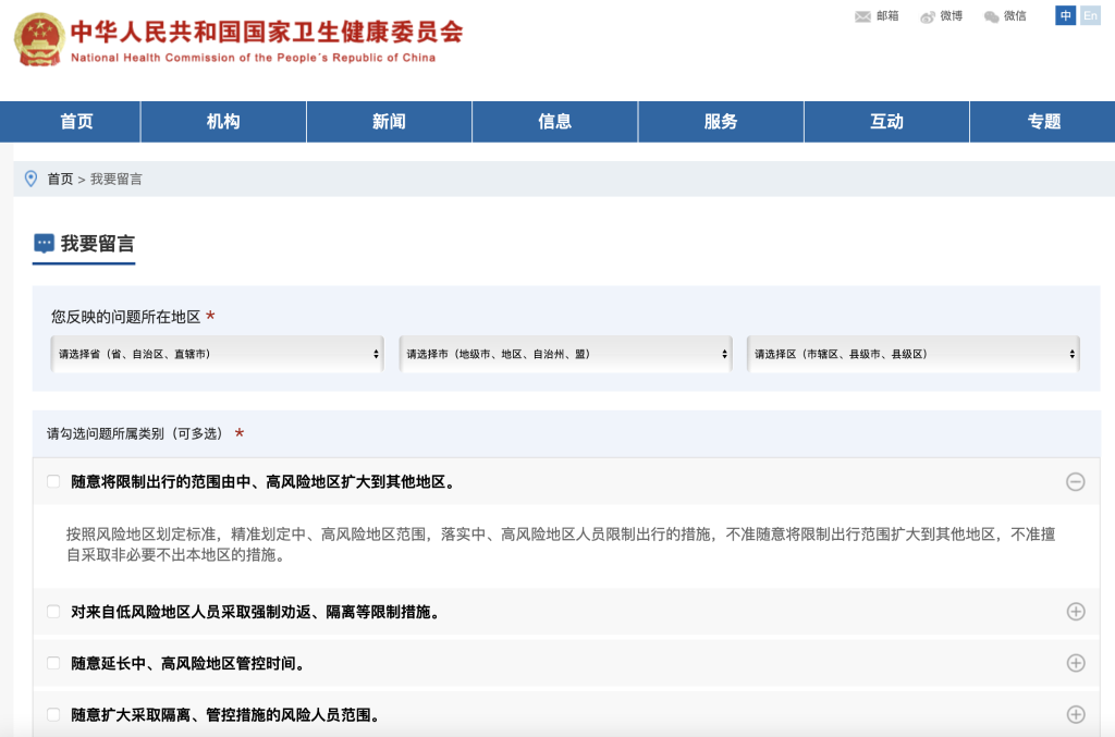 國家衛生健康委疫情防控“九不準”公眾留言板留言界面截圖
