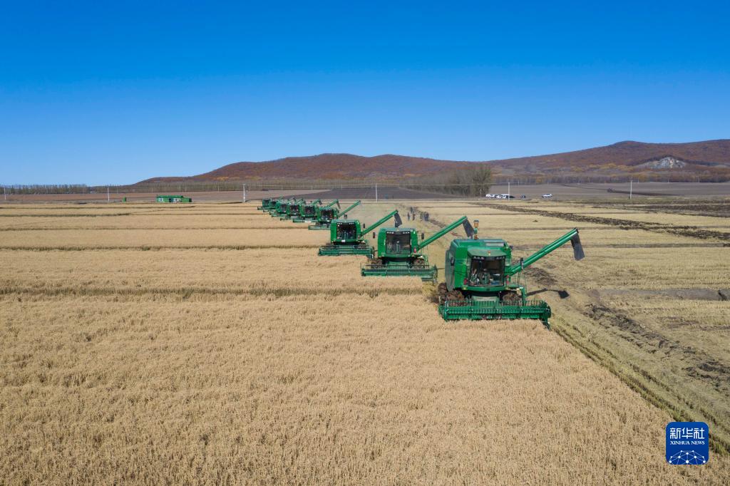在黑龍江省農墾勤得利農場(chǎng),種植戶(hù)駕駛機械收割水稻(2019年10月12日攝,無(wú)人機照片)。新華社發(fā)(謝劍飛 攝)