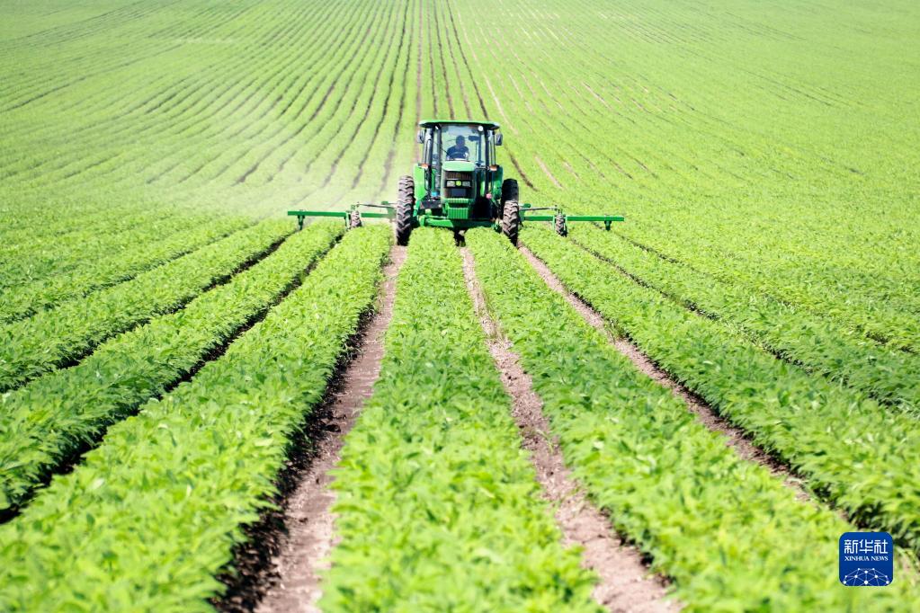 黑龍江北大荒農墾集團五大連池農場(chǎng)有限公司工作人員進(jìn)行大豆中耕除草作業(yè)(2022年6月29日攝)。新華社發(fā)(陸文祥 攝)