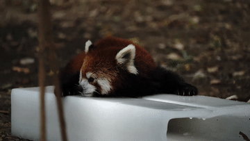 7月15日,上海野生動(dòng)物園的小熊貓在冰塊上避暑。